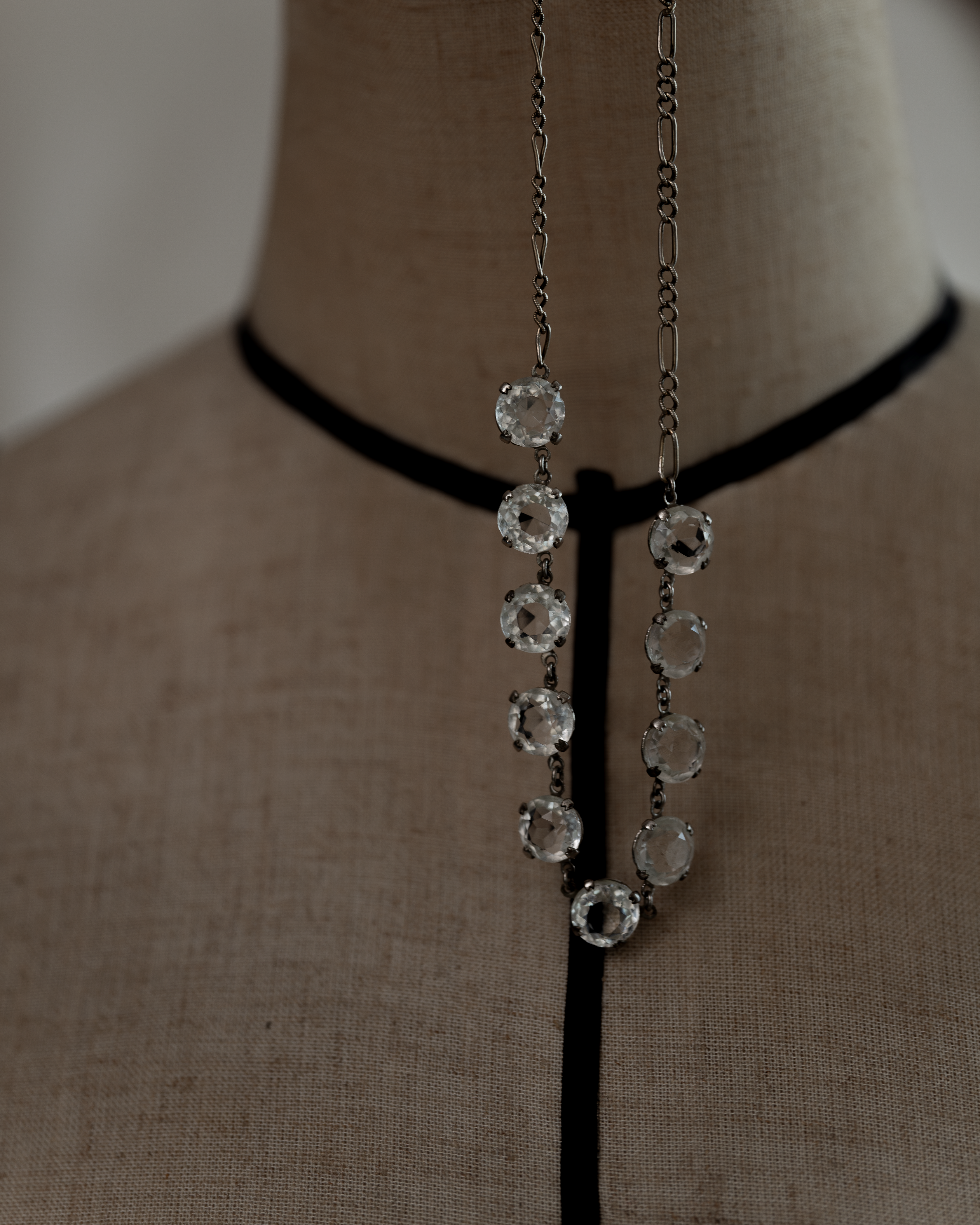 ネックレスを彩るクリアクリスタルは、美しいクッションカットが施されており、光を受けるたびに繊細なきらめきを放ちます。このカットは石に立体感と奥行きを与え、クリスタル特有の透明感を際立たせています。
