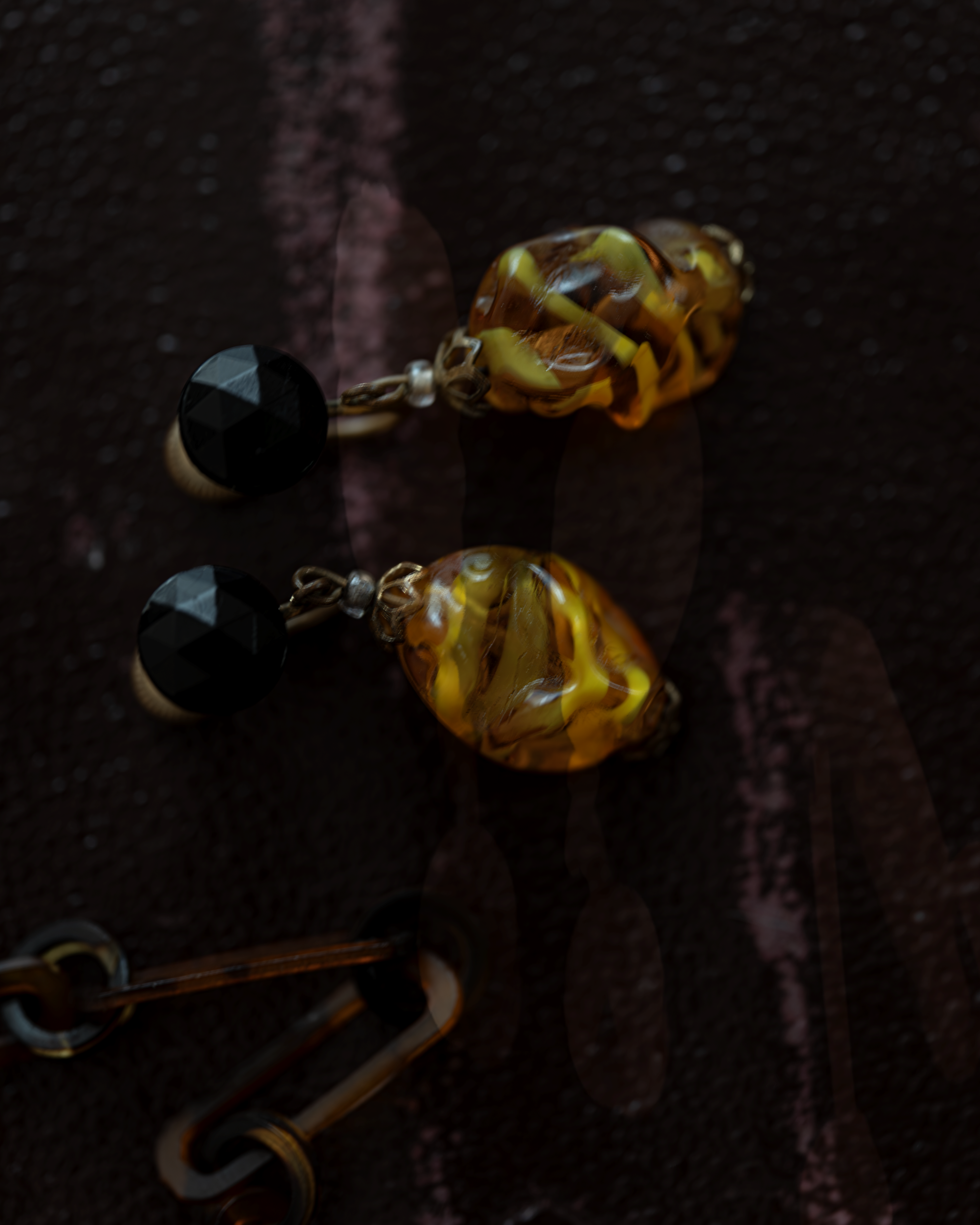 蜂蜜色のマーブルガラスにはブラウンのラインが入っており、蜂蜜のポットのようにも見えます。耳元の艶やかな黒いガラスビーズは、シックでクラシカルなアクセントを添えてくれています。