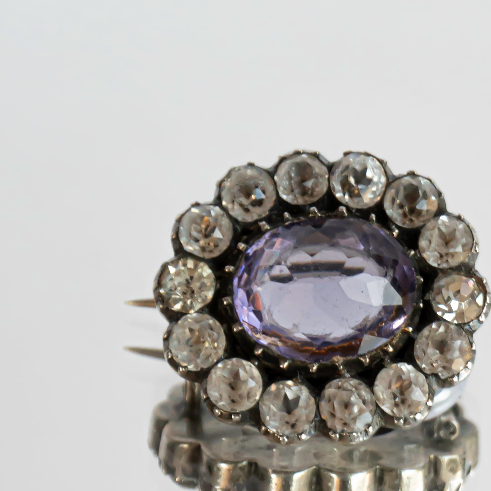 ブローチの金属部分は、おそらくシルバーで作られていますが、刻印はありません。この時代、宝石やグラスストーンの輝きを最大限に引き出すため、白く輝くシルバーが好んで使用されていました。